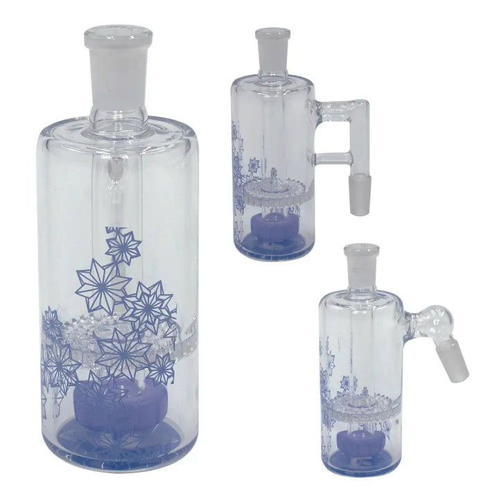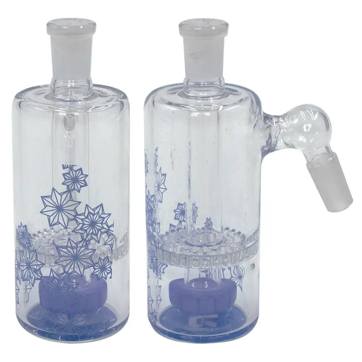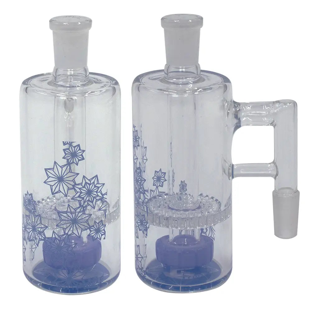 Elevate your smoke sesh with the Rekt Double Perc Ashcatcher - 4.5". Its unique design boasts a honeycomb perc and a showerhead perc, perfect for bongs with a 14mm joint. Choose from a 90 or 45 degree angle and rock the Rekt floral pattern print. Compatible with a 14mm male bowl or banger.