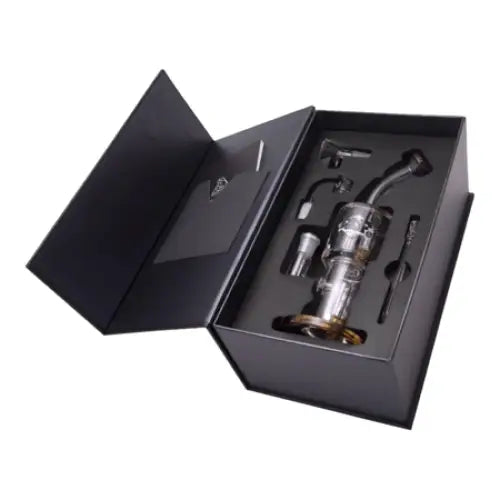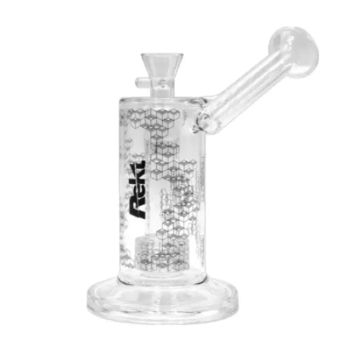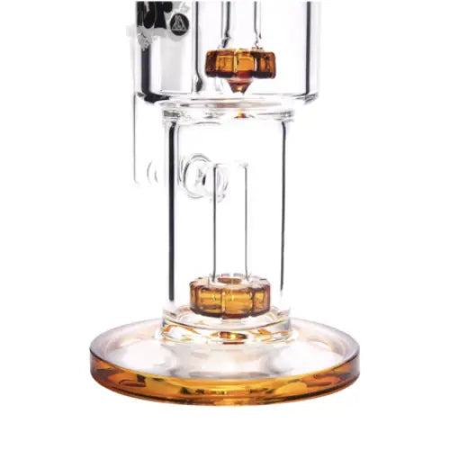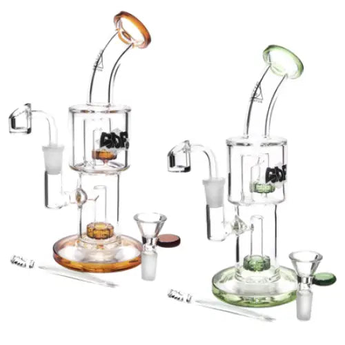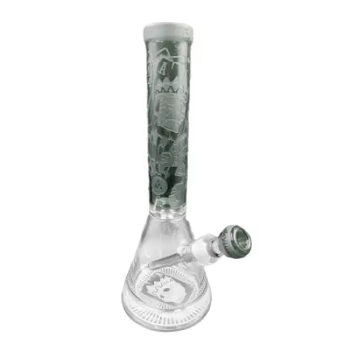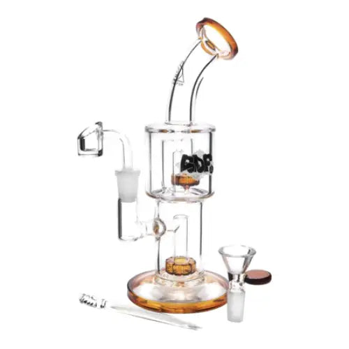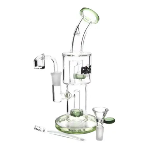 The Jah Jah bong from Squadafum features a groovy borosilicate glass design with not one, but two showerhead percs for extra bubbly and smooth hits. At 11" tall and 5mm thick, it includes a 14mm glass bowl, 14mm quartz banger, and quartz dabber. Choose amber or green and it comes with a carrying box for safekeeping.