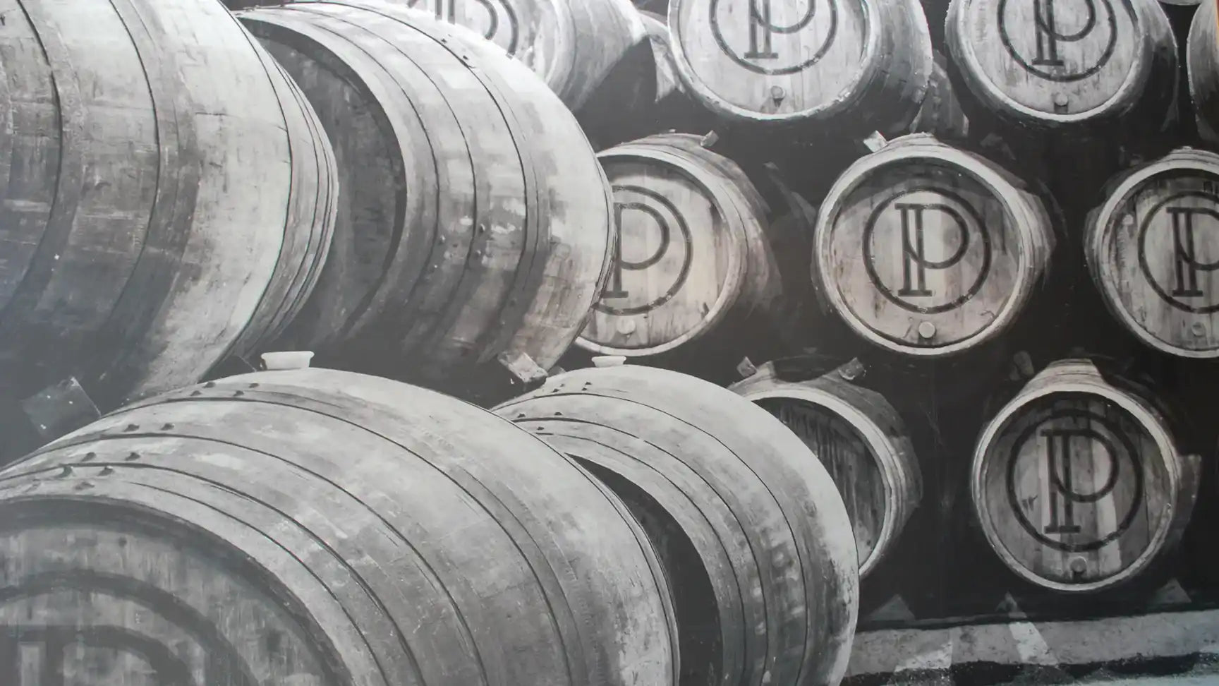 Wooden whiskey or bourbon barrels stacked with branded circular ends visible.