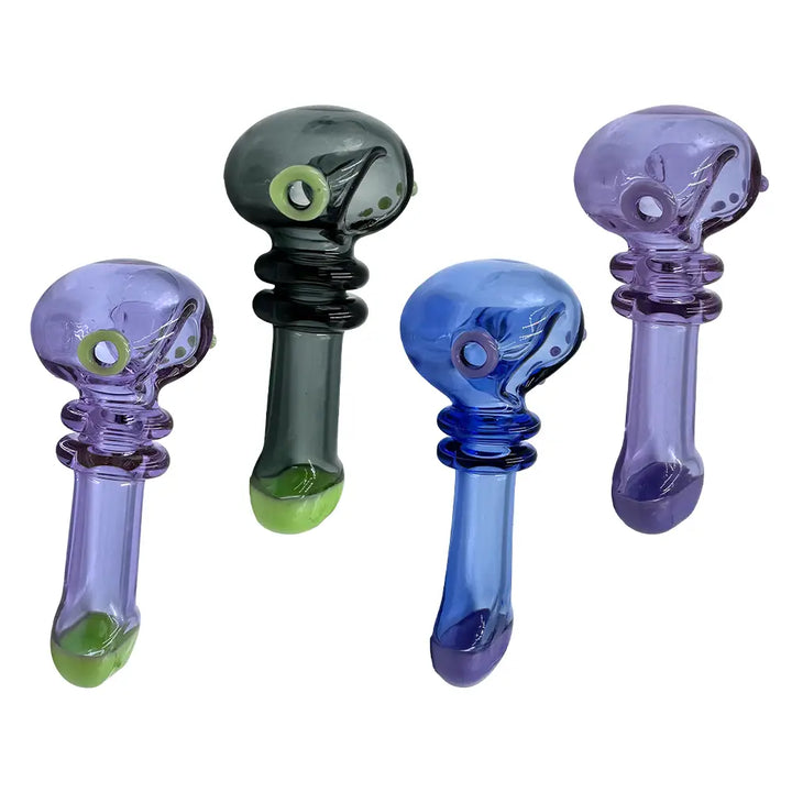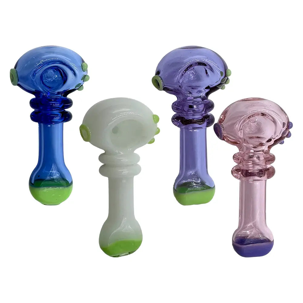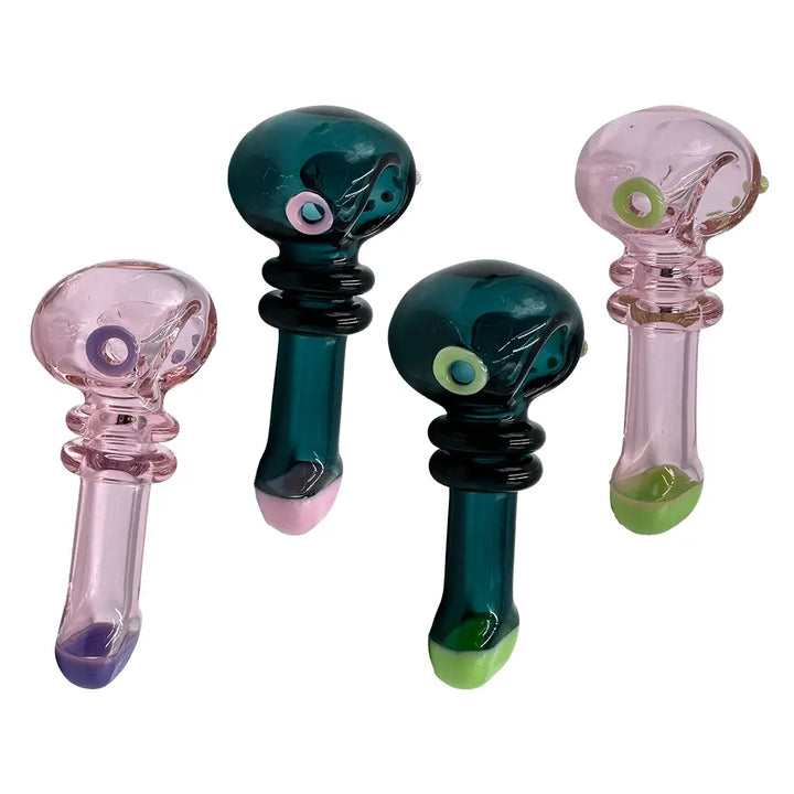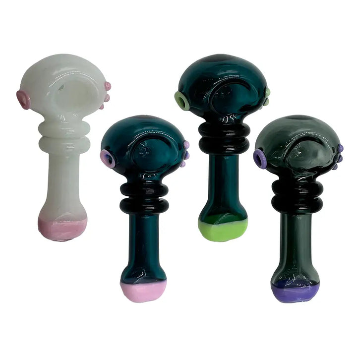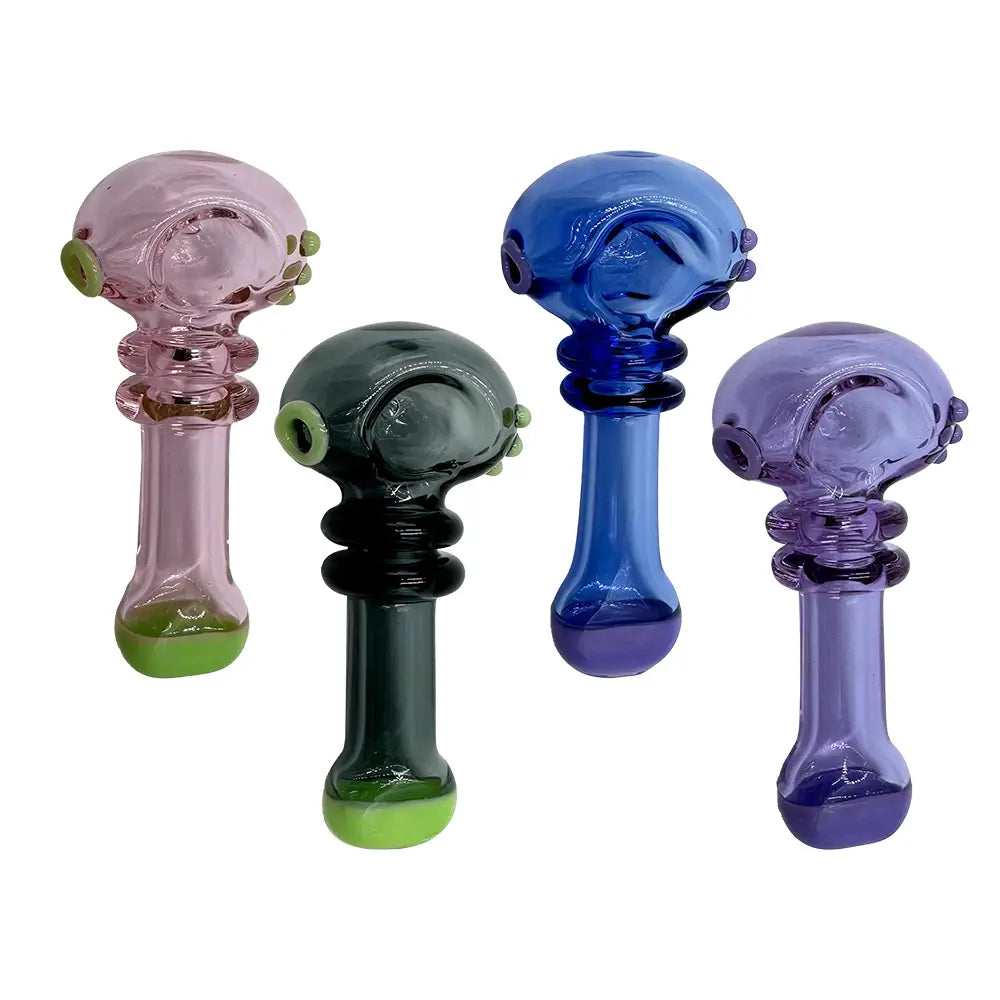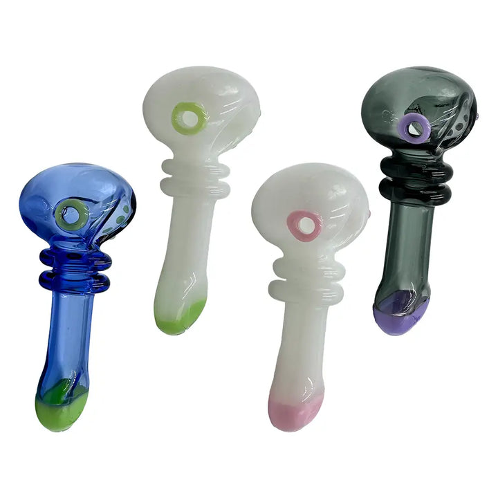 Get ready to light up in style with these funky hand-blown glass pipes! Each one is bursting with personality thanks to a range of vibrant colours and playful accents on the tips. And don't forget about the bowl's choke and handblown details that add a pop of contrasting colour. Smoking just got a little more fun!