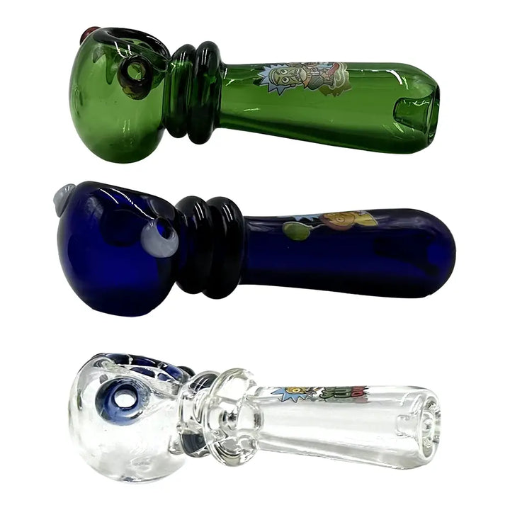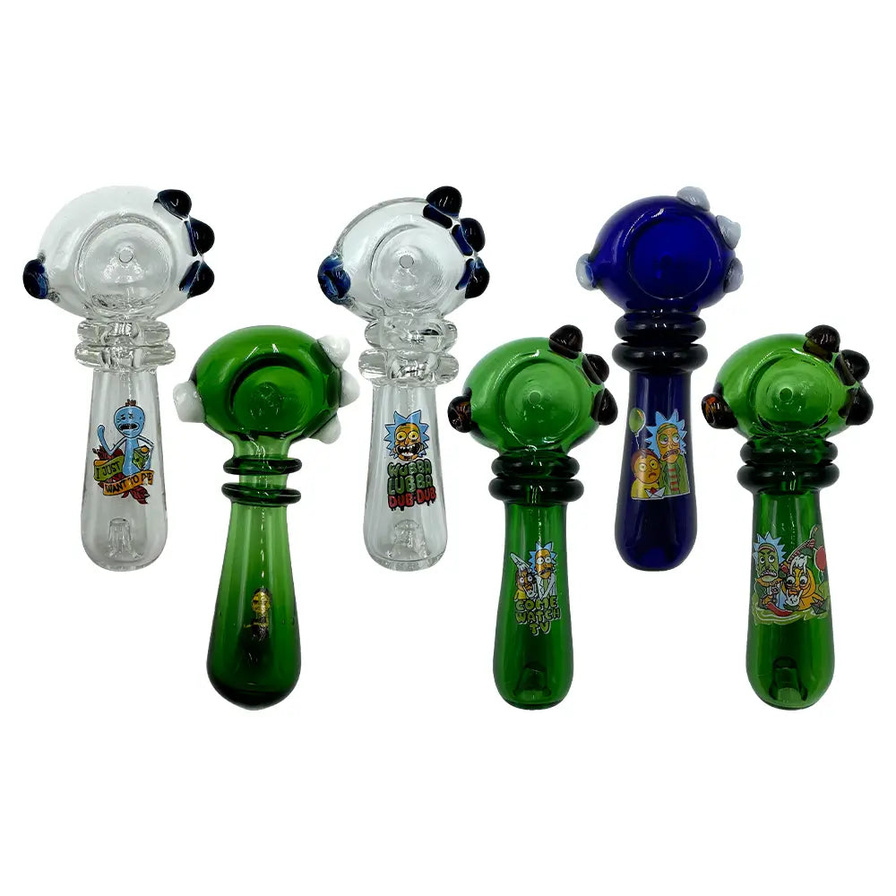 Get ready to blaze in style with the Amsterdam Glass - Rick N' Morty Glass Spoon Pipe. This 4" pipe features a vibrant design that pays homage to your favorite animated duo. Hand-crafted with high-quality glass, it delivers smooth hits for an out-of-this-world smoking experience.