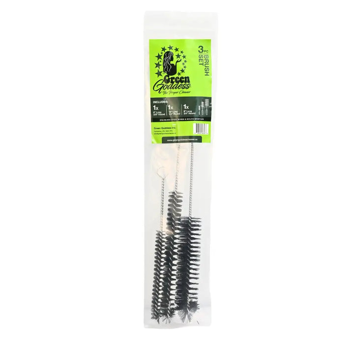 The Green Goddess 3pc Cleaning Brush Set provides essential maintenance capability for pipes and smoking accessories through its precision-engineered design. Constructed with galvanized steel wire, stainless steel components, and high-density nylon bristles, these implements deliver superior mechanical cleaning action with exceptional durability. The specialized configuration allows for effective navigation of restricted geometries while providing sufficient abrasive force to dislodge and remove persistent accumulations that compromise performance. This comprehensive tool set represents an optimal solution for maintaining functional integrity and hygienic conditions in specialized smoking apparatus.