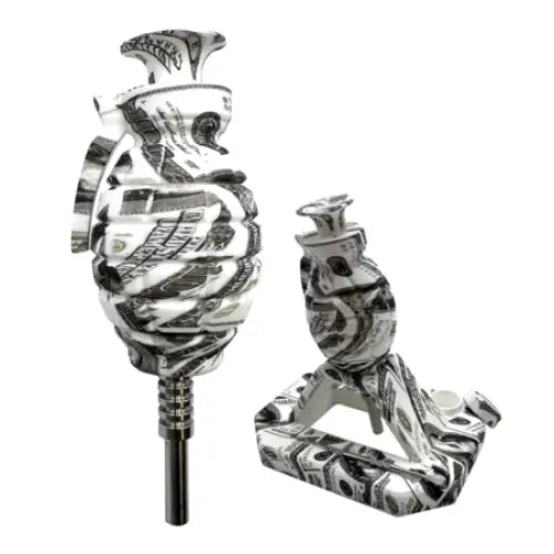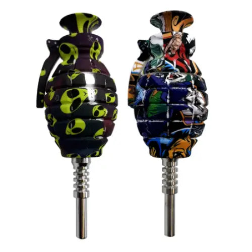 Get ready to launch your smoking experience to the next level with these silicone nectar collectors in the form of a grenade! Not only do they come with a cool silicone stand, but it also has a metal tool, titanium nail, and a convenient silicone storage compartment for your product. Get yours now in a variety of unique designs!
